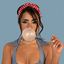 Woman with long dark hair wearing red lipstick and a white feathered garment.